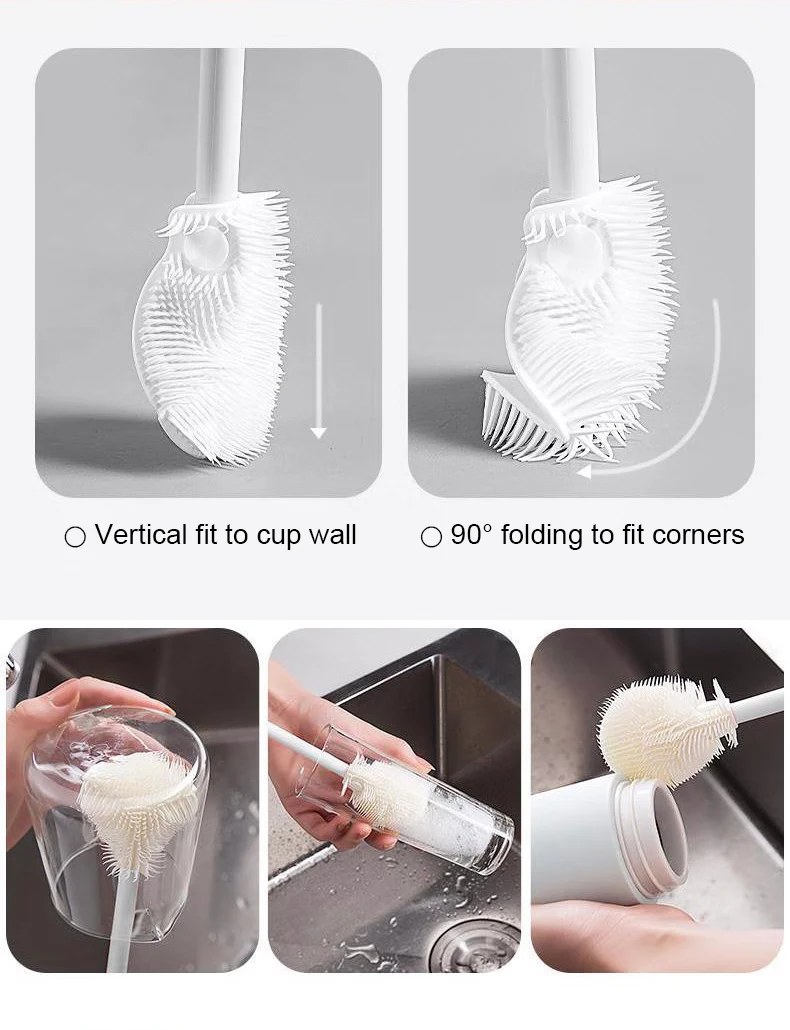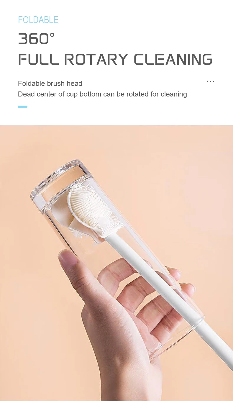 Folding brush head:Made of TPE bristles bristles, clean without dead ends, with soft and delicate bristles, to give cups and kettles a new look. The brush head can be folded to easily clean the bottom corner of the cup.