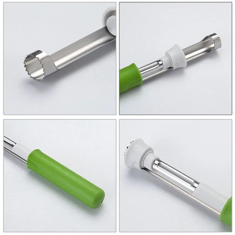 Easy to use: Simply align the front end of these tools with the fruit you want to core, press and rotate to remove the core, and push the expandable part as shown in the picture to remove the core from the tool.