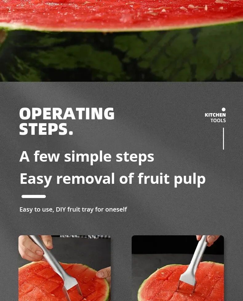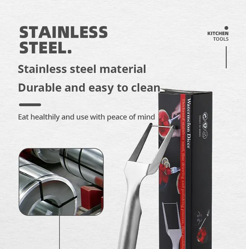 3. High-quality materials, the watermelon slicer is made of high-quality stainless steel, which is durable, anti-corrosion and anti-rust. The fork is finely polished and the edges are smooth and burr-free. High precision polished handle for comfortable hand feel.